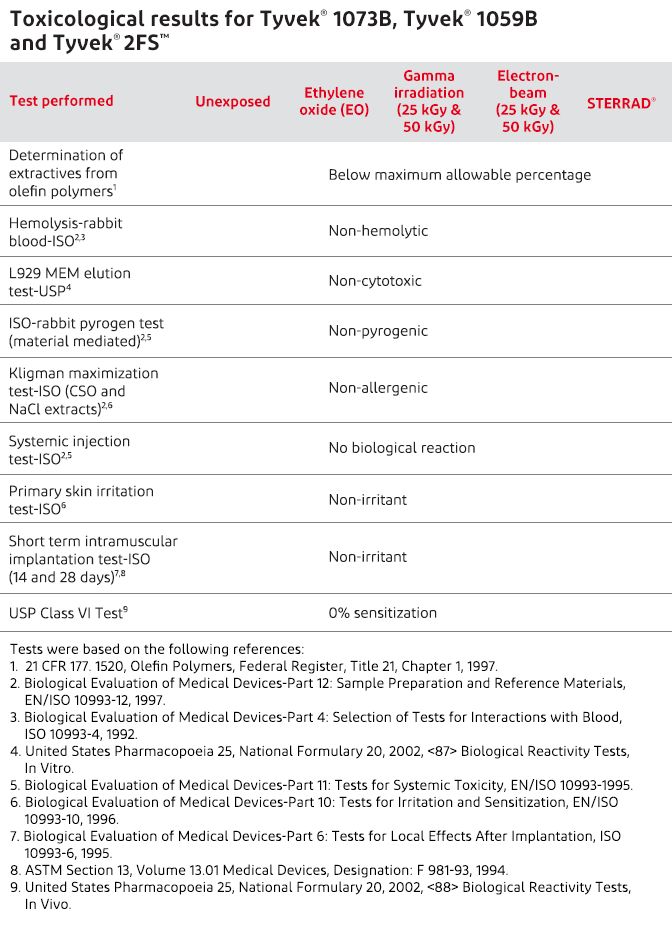 Tyvek® medical and pharmaceutical packaging styles meet all the acceptable performance criteria for biocompatibility—even after sterilization—when tested according to ISO 10993 and United States Pharmacopeia (USP).